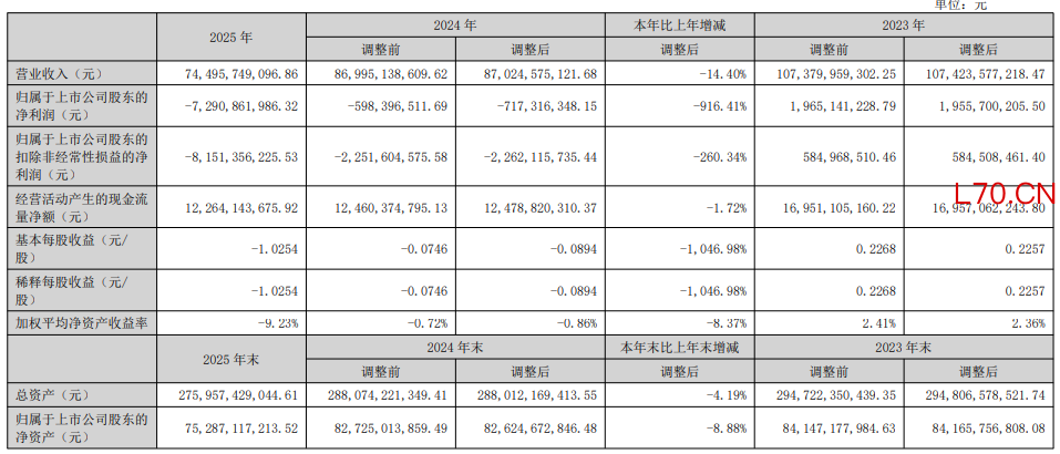 天山股份发布2025年年度报告显示,公司营业收入为744.96亿元,同比减少14.4%。归属于上市公司股东的净亏损为72.91亿元,同比扩大916.41%。归属于上市公司股东的扣除非经常性损益的净亏损为81.51亿元,同比扩大260.34%。基本每股亏损为1.0254元。