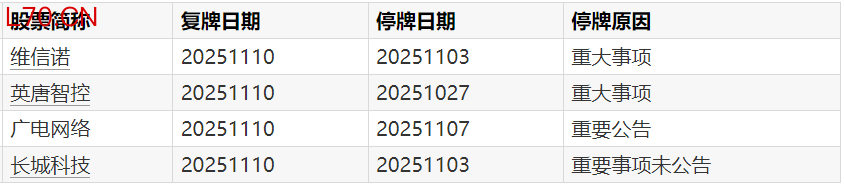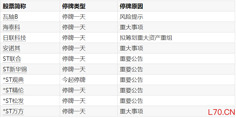 A股停牌提示:10股今日停牌