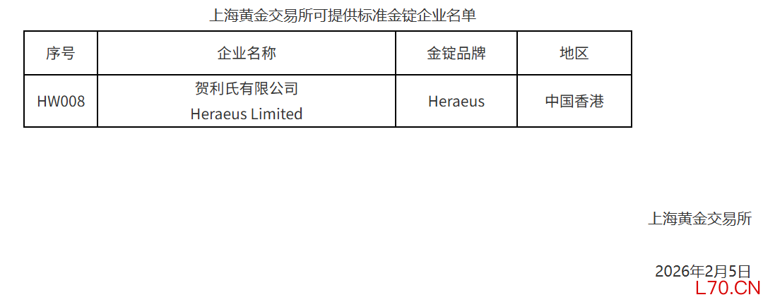 上海黄金交易所:新增贺利氏有限公司为境外可提供标准金锭企业