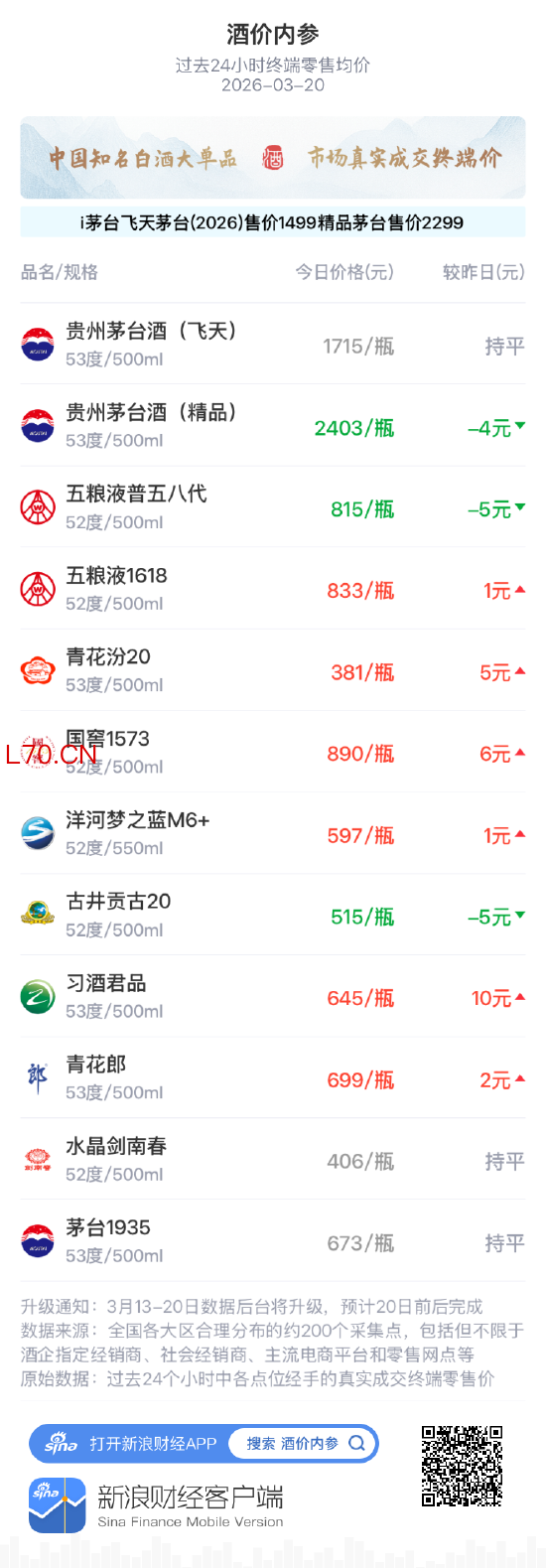新浪财经“酒价内参”过去24小时收集的数据显示,中国白酒市场各大单品的终端零售均价在3月20日延续分化走势,市场运行仍以区间窄幅波动为主。如果主要单品各取一瓶整体打包售卖,今日总售价为10572元,较昨日上涨11元。