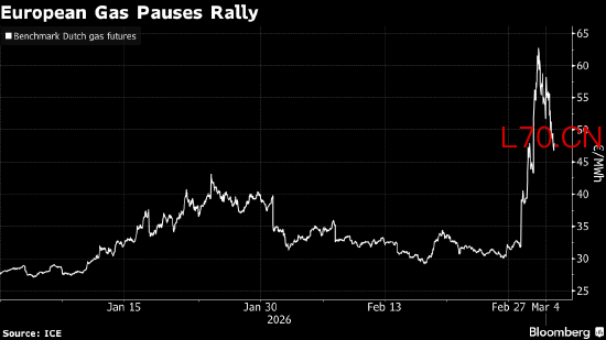 基准期货价格一度下跌16%,随后收复部分跌幅。尽管如此,自上周末美国和以色列开始轰炸伊朗以来,天然气价格仍累计上涨超过50%。