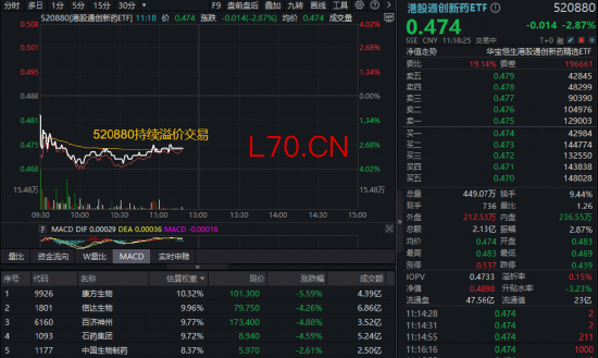港股医药波动更大,100%创新药研发标的——港股通创新药ETF(520880)、港股医疗T+0“利器”——港股通医疗ETF华宝(159137)同跌逾3%,两只ETF场内均呈现宽幅溢价,显示低吸资金涌动。
