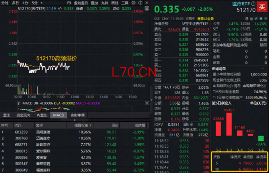 A股方面,医疗板块AI医疗、CXO概念跌幅居前,美年健康、泰格医药跌超3%,全市场规模最大医疗ETF(512170)跌逾2%再失5日均线,场内放量溢价,“抄底”资金或再度增仓,此前10日512170累获9.6亿元净申购。