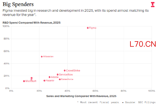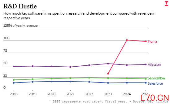 配资炒股澳大利亚软件公司 Atlassian 以项目规划工具 Jira 闻名,在截至 2025 年 6 月 30 日的最新财年中,公司研发支出达 27 亿美元,占当期营收的 51%。而 Figma 在 2025 年的研发成本超 10 亿美元,占全年营收的 97%。