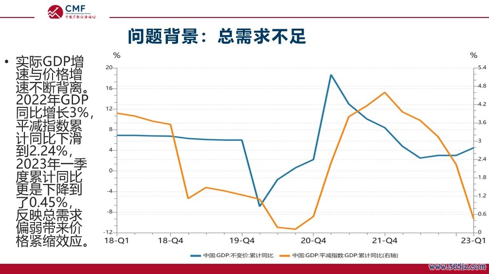 上图中,蓝色的GDP增长与黄色的GDP平减指数的剪刀差越来越大。2022年经济增长3%,GDP平减指数为2.24%;而今年一季度经济增长4.5%,GDP平减指数却下滑到0.45%。在季度统计中,GDP统计方式是生产法,更多度量的是生产侧;而价格则度量了市场交易水平,也就是实际需求所产生的购买力。两者间的背离明确告诉我们:当前需求和供给间的缺口正在不断放大。