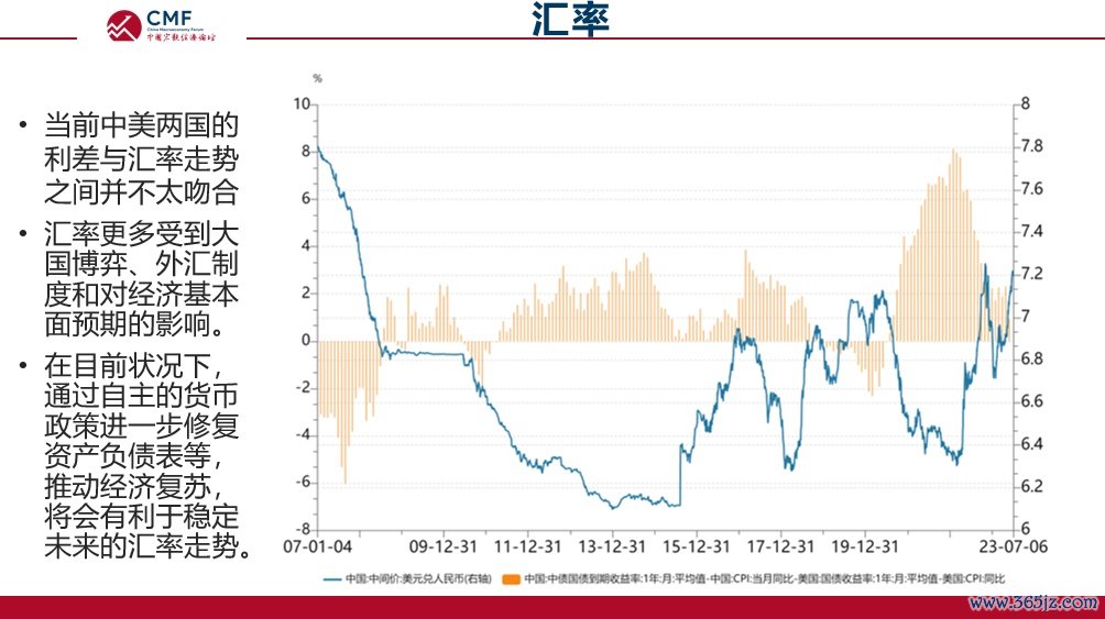 利率的第三个约束是汇率。无论是美元指数还是中美利差,都与中美间的汇率联系紧密。经粗略估算,2006年-2023年6月中美利差和汇率间相关性达到0.81,相关性很强。但是,近期二者的走势出现了一定分化。