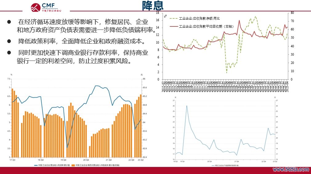 从企业端看,经济循环速度在逐渐放缓。上图中,红色曲线对应的工业企业应收帐款回收期在不断拉长,百元营收中的成本不断上行。这表明:一方面,当前经济循环放缓,企业收款时间变长;另一方面,成本上行将导致企业利润进一步降低。在这种情况下,资产负债表处于持续恶化的状态,需要进一步降低企业融资成本,降低利息支付,减缓成本端压力。在降息过程中,需要考虑到银行的净息差。因此,我们建议进一步全面降息,包括下调商业银行存款利率,从而保证一定的、正常的商业银行净息差空间,防止在商业银行领域出现过度风险积累。