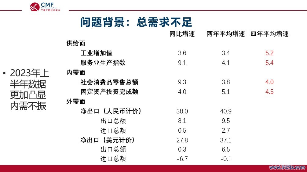2023年上半年供给侧加速修复,工业增加值和服务业生产指数四年平均增速平均在5.3%左右,但是国内需求四年平均在4.3%左右,供需缺口更加明显。