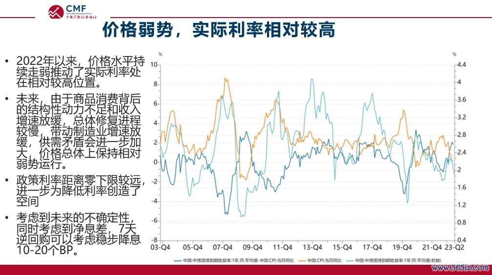 目前在空间上争议最大的是降息。预计下半年整体价格走势将保持相对偏弱的态势,其核心原因在于当前商品消费背后存在大量的结构性问题。消费不仅是一种经济现象,更是一种人的社会化表达,而目前消费创造的社会机制存在着一定的不足。在这种情况下,下半年整体消费的结构动力依然不会非常强,导致价格走势仍将保持相对偏弱的态势。这意味着在目前的名义利率下,实际利率水平是偏高的。上图中,蓝线是我们计算的实际利率。可以看到,2022年以来实际利率呈现上升态势,其背后的重要原因是价格下降得更快。虽然名义利率也在下调,但其下调速度赶不上价格增速的下滑速度,导致实际利率水平不降反增。这为进一步降息提供了空间。