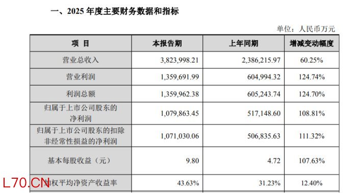 报告显示,中际旭创全年实现营业总收入382.4亿元,与2024年度相比增长60.25%;实现归属于上市公司股东的净利润为107.99亿元,同比大幅增长108.81%;实现扣除非经常性损益后的净利润为107.1亿元,同比增长111.32%。